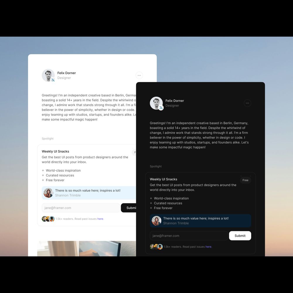 Landly is a sleek Framer template that is directed towards digital creators. It follows the trend of the narrow-container-mobile-first style for personal websites and features a range of elements to convert visitors into your audience. Enjoy its responsive design, dark mode support, and seamless CMS integration. Preview: https://landly.framer.website Get 3 free months on a Pro Site annual subscription by entering the following code at this link at checkout: partner25proyearly